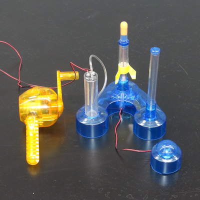分野 化学分野ですね。水の電気分解、水素と酸素の化学反応など。物理分野では、仕事とエネルギー、電磁誘導などでしょうか。 「気体分野」ではないですね。 内容 学研の科学「水素エネルギーロケット」です。 図1が、装置全体です。 中央やや右がロケットと発射台、左が手回し発電機、右下は圧電素子のロケット発射ボタンです。 ロケット本体の全長は12cmです。 図2のように、発射台には3本の透明なタワーがあります。 左のタワーには水を入れ、セスキ炭酸ソーダを溶かします。そこに、電極を備えたふたをして、手回し発電機で水の電気分解を行い、水素と酸素を発生させます。図2は、電気分解を行っているところです。 中央のタワーは中央上部に電極が備わり、発射ボタンで放電することができます。このタワーは水で満たし、ロケットを上から刺してセットします。 左のタワーの電気分解で発生した水素と酸素は、チューブを通って中央のタワーの下部から出てきて、ロケットの下にたまっていきます。中央のタワーの水は、水素と酸素がたまるにつれて、どこかへ逃げなくてはいけません。 右の背の高いタワーは、下部で細いチューブで中央のタワーの下部に繋がっています。タワーには水が入っていて、はじめは中央のタワーと同じ水位になっています。中央のタワーに水素と酸素がたまるにつれて、中央のタワーの水が右のタワーに逃げて、図2のように水位が上がってきます。右のタワーにはふたがあって、ふたの中央に小さな穴が開いていて、空気が少しずつ逃げられるようになっています。このふたなしではロケット発射のときに水位が急に変化し、爆発の力が逃げてしまってロケットが上手く飛ばなくなります。 水素と酸素がロケットの黄色い翼の付近までたまったら、水の電気分解をやめて、カウントダウンをしてから、図3のように射ボタンでロケットを発射します。 図4が、発射の様子です。 教室では、天井に勢いよくぶつかります。図4は放物運動して落ちてきたのではなく、天井にぶつかって落ちてきているものです。 ロケットの先端(図の黄色い部分)は、固めのスポンジになっていて、天井が傷つくことはありません。 また、ロケットの筒は、図のあちら側に、仰角 30°になるまで倒すことができます。適切な角度(仰角40°くらい)まで倒すと、ロケットを教室の後ろの方まで飛ばすことができます。 図5は、製品パッケージです。 購入先 ・書店または通信販売 学研の科学「水素エネルギーロケット」 2,700円+税 (2,970円) ただし初版のもの 2022年7月に初版が発刊されましたが、2025年6月に再販されました。 再販の価格は、3,500円+税(3,850円)となっています。 図は、初版のものですが、再販のものも同じだと思います。 宮田 佳則 (新潟第一高校) |