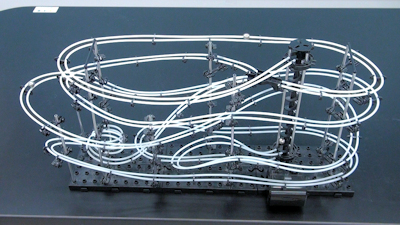 ジェットコースターの模型のようなものです。図1〜3の、右寄りに写っている黒いタワーは、アルキメデスの螺旋ポンプのような機構でモーターで回り、小さな鉄球を上に移動させます。鉄球は、図3のように、一番高いところから2本の樹脂製のレールの上を通って滑走を始めます。