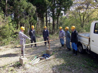 県道沿いなので通勤・通学の人の目にふれるため、社員は真剣です。 |