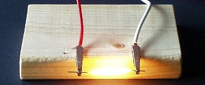分野 ジュール熱 黒体輻射 内容 よく知られた実験です。 ワニ口クリップにシャープペンシルの芯(Bがよい)をつなぎ、電流を流します。電源にスライダックを用い、まず少し電流を流して芯に含まれているプラスチック成分を蒸発させます。これをしないと、芯が破裂する場合があります。 ある程度煙が出たら、電圧を上げると、芯全体がとても明るく輝きます。やがて、芯の炭素が燃焼して(空気中の酸素と結びつき、二酸化炭素となる)だんだん細くなり、いわゆる、切れます。 なお、これを液体窒素の中で行うと、まわりに酸素がないため、長時間光り続けさせることができます。 二酸化炭素の中での実験 周囲に酸素がなければ、芯は細くならないはずですので、二酸化炭素の中でおこなったら長持ちするのではないかと思い、やってみました。 結果は、失敗です。 C+O2→CO2とはならないのですが、ジュール熱で、芯が剥離するようにどんどん細くなり、やはりすぐ切れてしまいました。 左下の写真が、切れたあとの様子です。 |
