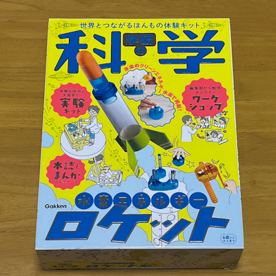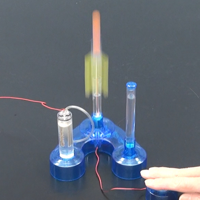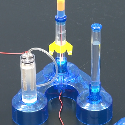 分野 化学分野ですね。水の電気分解、水素と酸素の化学反応など。物理分野では、仕事とエネルギー、電磁誘導などでしょうか。 「気体分野」ではないですね。 内容 学研の科学「水素エネルギーロケット」です。 図1が、装置全体です。 中央やや右がロケットと発射台、左が手回し発電機、右下は圧電素子のロケット発射ボタンです。 ロケット本体の全長は12cmです。 図2のように、発射台には3本の透明なタワーがあります。 左のタワーには水を入れ、セスキ炭酸ソーダを溶かします。そこに、電極を備えたふたをして、手回し発電機で水の電気分解を行い、水素と酸素を発生させます。図2は、電気分解を行っているところです。 中央のタワーは中央上部に電極が備わり、発射ボタンで放電することができます。このタワーは水で満たし、ロケットを上から刺してセットします。 左のタワーの電気分解で発生した水素と酸素は、チューブを通って中央のタワーの下部から出てきて、ロケットの下にたまっていきます。中央のタワーの水は、水素と酸素がたまるにつれて、どこかへ逃げなくてはいけません。 右の背の高いタワーは、下部で細いチューブで中央のタワーの下部に繋がっています。タワーには水が入っていて、はじめは中央のタワーと同じ水位になっています。中央のタワーに水素と酸素がたまるにつれて、中央のタワーの水が右のタワーに逃げて、図2のように水位が上がってきます。右のタワーにはふたがあって、ふたの中央に小さな穴が開いていて、空気が少しずつ逃げられるようになっています。このふたなしではロケット発射のときに水位が急に変化し、爆発の力が逃げてしまってロケットが上手く飛ばなくなります。 水素と酸素がロケットの黄色い翼の付近までたまったら、水の電気分解をやめて、カウントダウンをしてから、図3のように射ボタンでロケットを発射します。 図4が、発射の様子です。 教室では、天井に勢いよくぶつかります。図4は放物運動して落ちてきたのではなく、天井にぶつかって落ちてきているものです。 ロケットの先端(図の黄色い部分)は、固めのスポンジになっていて、天井が傷つくことはありません。 また、ロケットの筒は、図のあちら側に、仰角 30°になるまで倒すことができます。適切な角度(仰角40°くらい)まで倒すと、ロケットを教室の後ろの方まで飛ばすことができます。 図5は、製品パッケージです。 購入先 ・書店または通信販売 学研の科学「水素エネルギーロケット」 2,700円+税 (2,970円) ただし初版のもの 2022年7月に初版が発刊されましたが、2025年6月に再販されました。 再販の価格は、3,500円+税(3,850円)となっています。 図は、初版のものですが、再販のものも同じだと思います。 宮田 佳則 (新潟第一高校) |