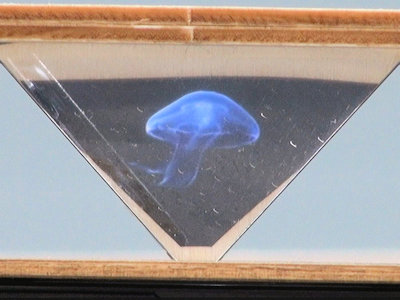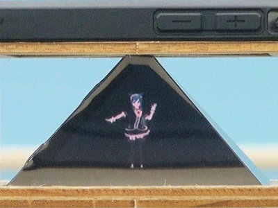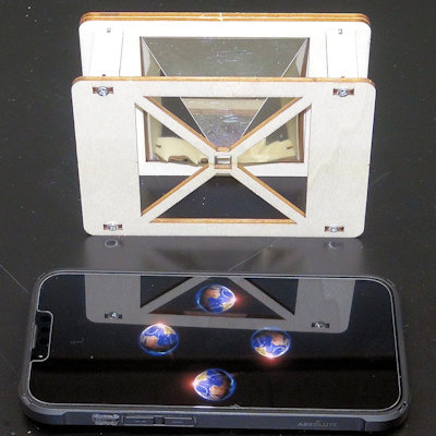 分野 光の反射 内容 いわゆる本当のホログラムではなく、疑似ホログラムのひとつです。ペッパーズ・ゴースト(Pepper's ghost)と呼ばれる視覚トリックを応用して、3Dホログラムのように見せる技術です。 透明または半透明の樹脂板に映像を反射させて、板の向こう側にある景色と、反射された映像とが同時に見えることで、本物の物体がそこに存在しているような錯覚をさせるものです。 図1のように、下にはスマートフォンが置いてあり、その上にピラミッドをひっくり返したように、ハーフミラーを配置します。真横から見ると、スマホの映像がハーフミラーに映って、あたかも空中に存在しているように見えるものです。 図2のようになっています。 図3のような専用の映像がYoutubeに多数投稿されていて、四方のどちらからでも見えるようになっています。 図1の写真では、立体的に見えませんが、肉眼で見ると、それなりに立体的に、空中に浮かんでいるように見えます。 図4は、拡大したものです。 図5は、スマホを上に置いたものです。Youtubeの映像が、中央が下の画像で作成されたものはスマホを装置の下に置き、映像の中央が上の画像で作成されたものは、スマホを上に置くことになります。 薄い塩ビ板やアクリル板、プラ板等を使って装置を自作する記事が、多数Webに載っています。 この度の写真は、キットを組み立てたものです。 購入先 ネット通販 約1,000円程度 |