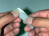 (1)(2)プラスチックミラーを、青いビニールがはってある面を内側にして、筋にそってゆっくりと折り曲げ、三角形をつります。 | |||