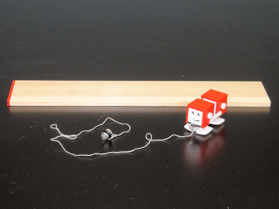 図2は、トコトコ人形と糸、ナットのおもり、そして、つるつるした机の上では上手く歩きませんので、上を歩かせる木の板です。