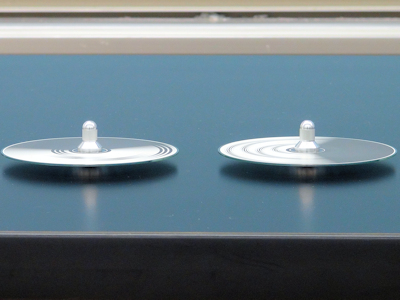 中央上に見えるのは、「CD独楽アルミ軸」で、図3のようになっており、CDの中央の穴に両側から挟むように取り付けることで、図4のようにとても安定してまわるCDコマができます。