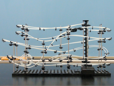 ジェットコースターの模型のようなものです。図1〜3の、右寄りに写っている黒いタワーは、アルキメデスの螺旋ポンプのような機構でモーターで回り、小さな鉄球を上に移動させます。鉄球は、図3のように、一番高いところから2本の樹脂製のレールの上を通って滑走を始めます。
